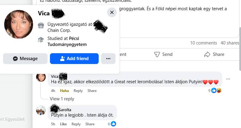 A hölgy tehát a hivatkozott orosz álhírt (miszerint Putyin nem tréfál, kiutasította a Rotschild-család tagjait és érdekeltségeit Oroszországból) azzal kommentelte, hogy végre a Great Resetet felszámolja valaki, Isten áldja Putyint, azt a pszichopata, paranoiás tömeggyilkost. Zászló-zászló-szív. Az alatta lévő hölgy (egy fiatal roma hölgy, kisgyerekkel, tisztességes, rendezett háttér, állásban van, minden oké, tök normálisnak tűnik, de…) hasonlóan Putyin-dicsőítő. Mindkét hölgy mentsége, hogy bedőltek a kormánypropagandának.