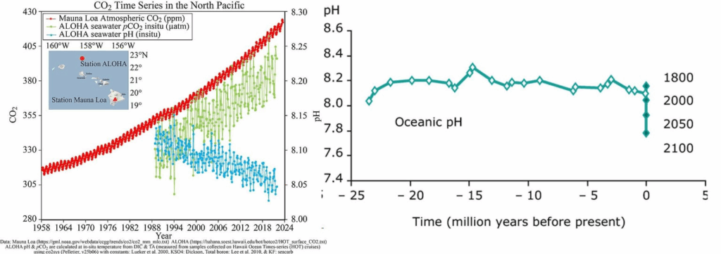 Ha valaki esetleg tagadná a légköri felmelegedés tényét (bár a kommentekből kitűnik, ma már senki nincs ilyen, ma már a “klímaszkeptikusok” is azzal érvelnek, a klíma mindig is változott [ami egyébként igaz, csak nem ilyen gyorsan, mint most, mert a mostani változás a természetesnek kb. 100-szorosa, és kb. egy bolygónkba becsapódó kisbolygó erejével ér fel, na meg, még ezeknek a lassú változásoknak is minden esetben tömeges kihalás volt a következménye]), akkor azt kell mondanom, hogy az óceáni elsavasodás viszont valami olyan, ami az elmúlt 30 millió év legsúlyosabb környezeti változása. Egyszerűen tagadhatatlan. Még az emberiség történelmében megjelent apróbb kilengések (kis jégkorszak, középkori meleg időszak, római kori optimum) sem változtattak semmit észrevehetően az óceánok lúgosságán. (Oké, a jobboldali kép csal, mert projektál: 2050-et és 2100-at is felhelyezte rá, ám a jelenlegi adatok szerint is a logaritmikus PH-skálán megfigyelhető 0,1 pontos változás valójában 26 százalékos savasodást jelent, és ez a már 1950-2020 között megtörtént.)