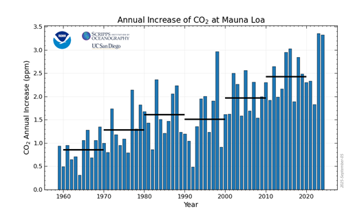 A légköri széndioxid-koncentráció folyamatosan emelkedik, az elmúlt időben pedig trendszerűen nagyobb az emelkedés, mint korábban volt, ami jelezheti azt is, hogy több energiahordozót égetünk el, de inkább azt, hogy a bioszféra elnyelői már kevesebbet tudnak felvenni abból: azaz, csökkent azok semlegesítő kapacitása.