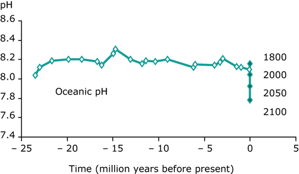 Az óceáni PH-ját mutató Ólafsson-görbe, proxyadatok alapján intrapolálva a múltba és előrejelzések alapján extrapolálva a jövőbe. Kép forrása: https://www.eea.europa.eu/en/analysis/maps-and-charts/ocean-acidity-over-the-past