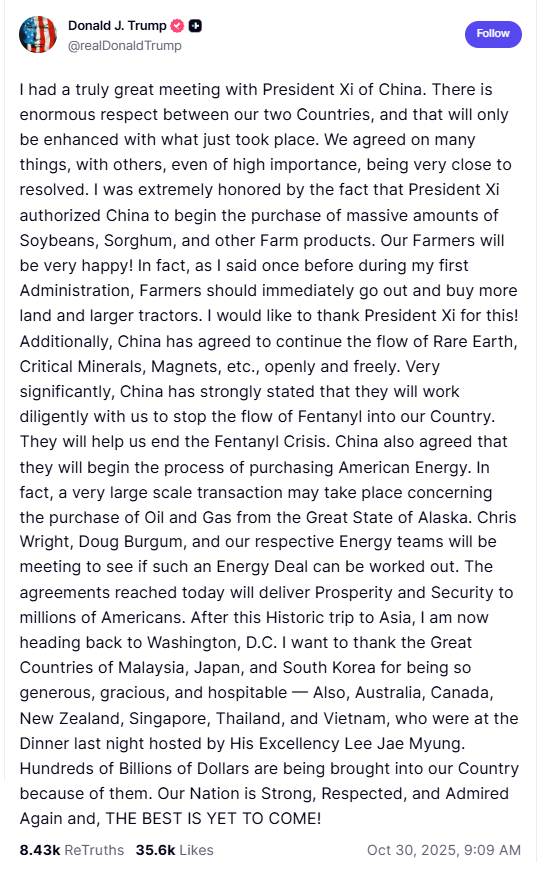 Az amerikai elnök rendkívül büszkén jelentette be október 30-án, a kínai főtitkárral való dél-koreai találkozás napján, hogy a tárgyalások „elképesztőek” voltak, és hogy rendkívül hálás Hszi Csin-pingnek, hogy jóváhagyta, hogy a kínai cégek szójababot, cirokot és más mezőgazdasági terméket vásároljanak az Egyesült Államok termelőitől. (Az elnök tipikus nagyzoló stílusában hozzátette, hogy ezzel eljött az ideje, hogy a farmerek nagyobb traktorokat vegyenek.) A siker-katalógusban benne van, hogy Kína egy évig elhalasztja a ritkaföldfémek amerikai exportjának blokkolását, hogy a kommunista ország beszáll az amerikai természetvédelmi körzetekben megnyitott nyersanyag-kitermelésbe, illetve, hogy a Fentanyl nevű opioid gyógyszer Amerikába tartó illegális becsempészését jobban fogja ellenőrizni.