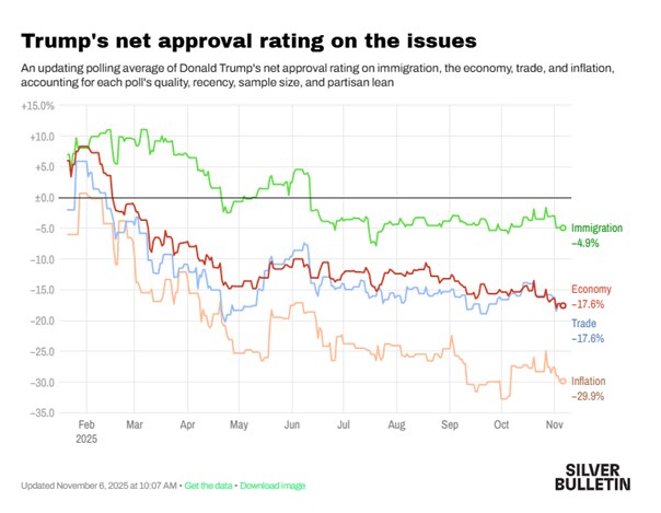 A kezdődő gazdasági nehézségek lehetnek felelősek nem csak a republikánus párt vártnál is gyengébb keddi választási eredményeiért, de az elnök eddigi leggyengébb népszerűségi mutatóiért is: a Nate Silver által szerkesztett Silverline oldalon az aggregált népszerűségi mutatója már csak 42,1 százalékos, de az összes jelentős kérdésben (bevándorlás, gazdaság, infláció, kereskedelem) is többen elégedetlenek a tevékenységével, mint amennyien támogatják őt.