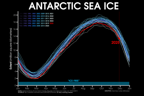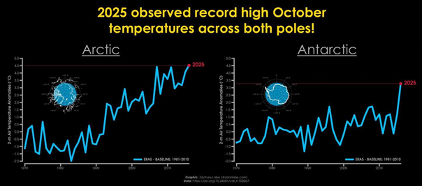 A jégpáncél jelenlegi 9,2 millió négyzetkilométeres kiterjedése még a 2000-es évekéhez képest is közel 2 millió négyzetkilométerrel kisebb, nemhogy az 1980-as évekéhez képest. S mivel az északi féltekén tél van és a Jeges-tenger egyre jobban eljegesedik, a nyári veszteséget ez sem képes pótolni. Bár a déli féltekén nyár van, és így az ottani jégtakaró csökkenése természetes folyamat, az is rekordközeli mértékben alacsony kiterjedésű. Ez összefüggésben van azzal, hogy mindkét sarkon rekordmeleg októberi hőmérsékletet mértek: