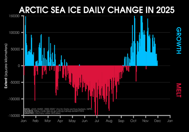 Megdöbbentő adatokat tett közzé dr. Zachary Labe klímatudós. Az adatvizualizáció szerint – ezek forrása a Japán Űrkutatási Ügynökség – soha még ilyen alacsony nem volt az év azonos napjában az északi-sarki jég kiterjedése a mérések kezdete óta, mint 2025-ben. Ezzel együtt a jég vastagsága is folyamatosan csökken, az anomália elsősorban a Szibéria és Alaszka „feletti” részeket érinti.