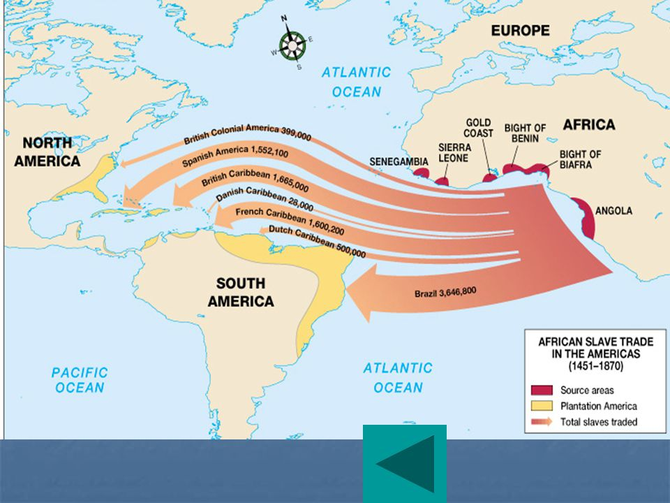 A picivel fentebbi ábrából is látszik, hogy a Karib-tenger szigeteire hamarabb és több rabszolga érkezett, akiket a spanyolok hoztak. A negro szó spanyolul jelenti azt, hogy fekete; mivel az angol nyelvű kolóniák ezt a szót átvették a spanyoloktól, valószínűleg az egész intézményt is tőlük vették át, és a rabszolgákkal való (kegyetlen) bánásmódot is.