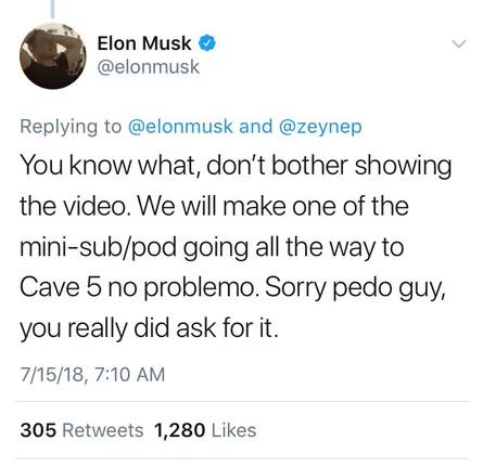 A mentőexpedíciót sikeresen levezénylő Vernon Unsworth-ot Musk azért nevezte “pedó fickó”-nak, mert az elutasította Musk agyament segítsétét.
