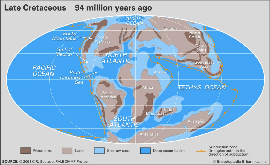 Az alábbi képen látható, hogy a Tethys-óceán hogy nézett ki kb. 152 millió évvel ezelőtt. Attól jobbra, ami ma Dél-Amerika és Afrika együtt (Gondwana), a jelenlegi Ázsia alatt, az volt a Tethys-óceán.